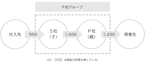 - P社は当期にS社から1,000百万円で仕入れた商品を、グループ外の得意先に1,200百万円で売却した。