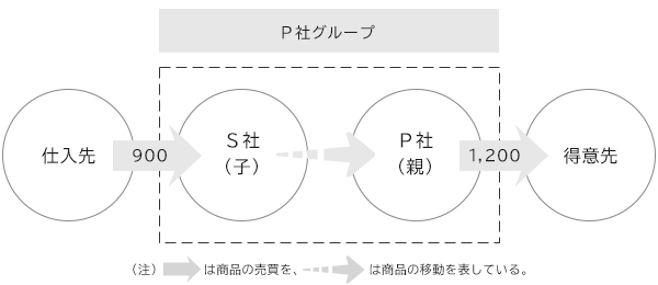 P社グループ全体としては、S社からP社に保管場所を移動した上で、保有していた商品を得意先に1,200百万円で売却したのと同じです。これを表したのが【図表4】です。