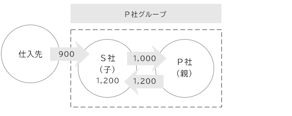 - P社は当期にS社から1,000百万円で仕入れた商品を、S社に1,200百万円で売却した。