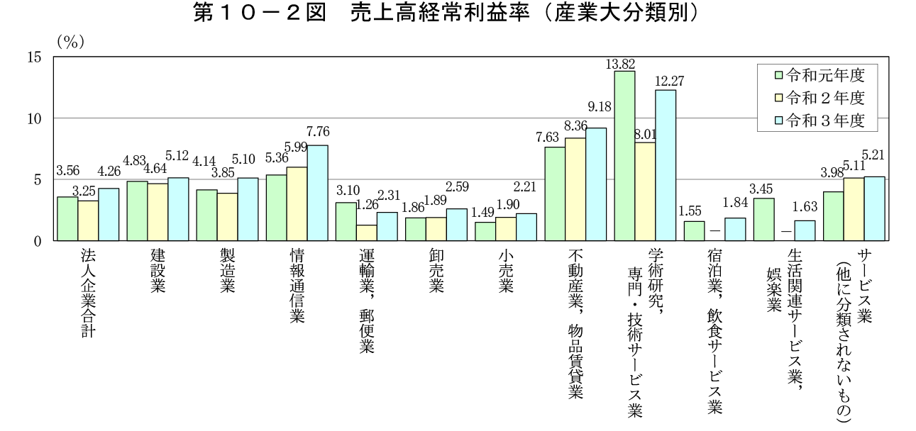 なお、【図表4】の「宿泊業、飲食サービス業」や「飲食店」を見ると、売上高営業利益率より売上高経常利益率の方が大きく上回っていますが、これは、営業外収益としてコロナの助成金等が計上されているのではないかと推測されます。