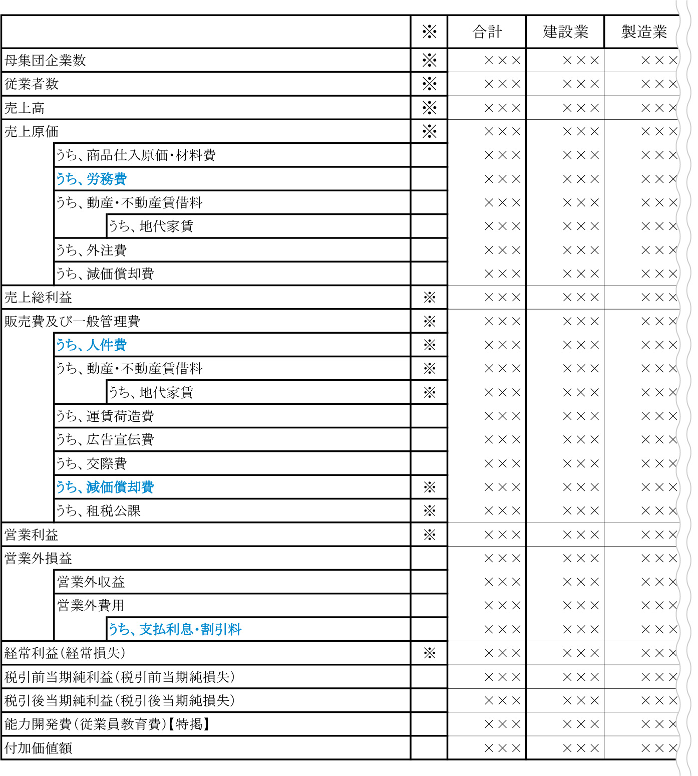 (注)実際には上表の1行目の項目が「建設業」や「製造業」などの大分類での業種(11業種)と、さらに中分類での業種(67業種)まで細分されている。個人企業についての統計表では、「※」欄に※印を付けた科目等についてのみデータが集計されている